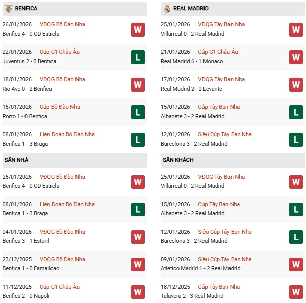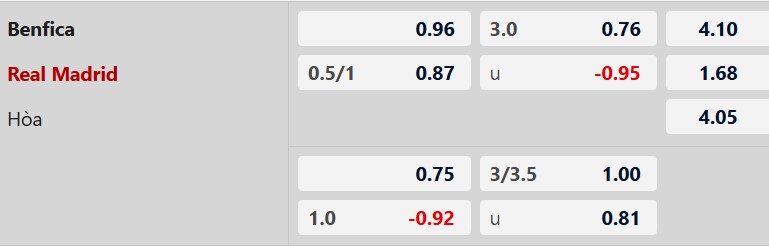 - Benfica thắng 1, hòa 1, trong 2 trận gặp Real Madrid gần đây.