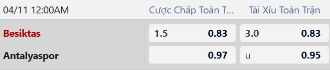Mức chấp 1 1/2 bàn cho thấy sự vượt trội của Besiktas. Với phong độ ổn định cùng hàng công đang vào phom, đội chủ nhà hoàn toàn có khả năng tạo ra chiến thắng cách biệt. Trong khi đó, Antalyaspor thi đấu kém trên sân khách và hàng thủ thiếu chắc chắn, khó đứng vững trước sức ép lớn.