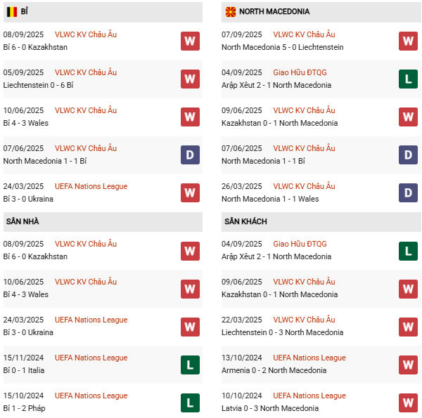 - Bỉ thắng 2, hòa 1 trong 3 trận gặp Bắc Macedonia gần đây.