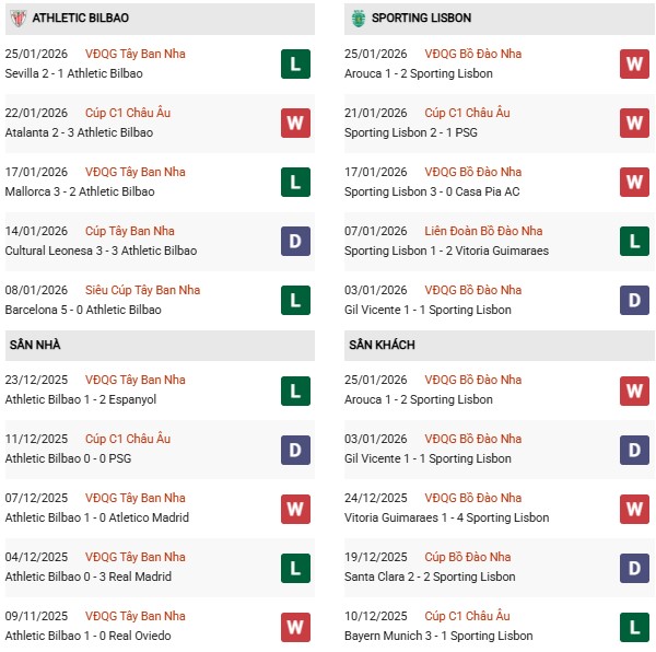 - Bilbao thắng 1, thua 2 trong 3 trận gặp Sporting Lisbon gần đây.