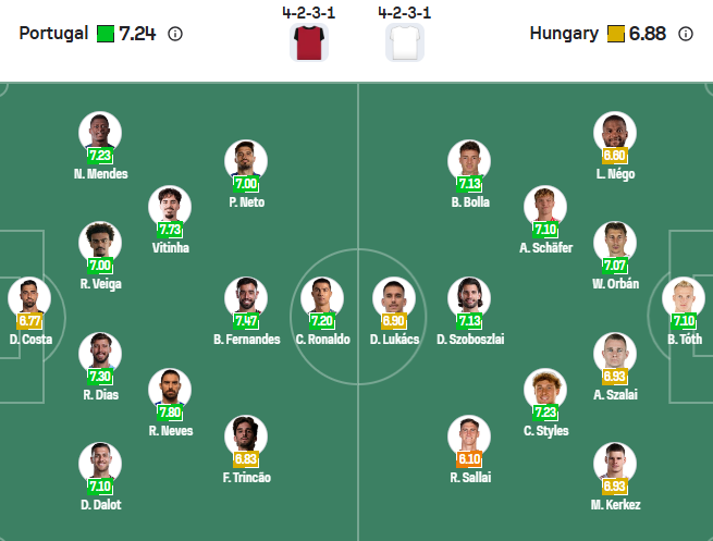 - Bồ Đào Nha thắng 6, hòa 1 trong 7 trận gặp Hungary gần đây.