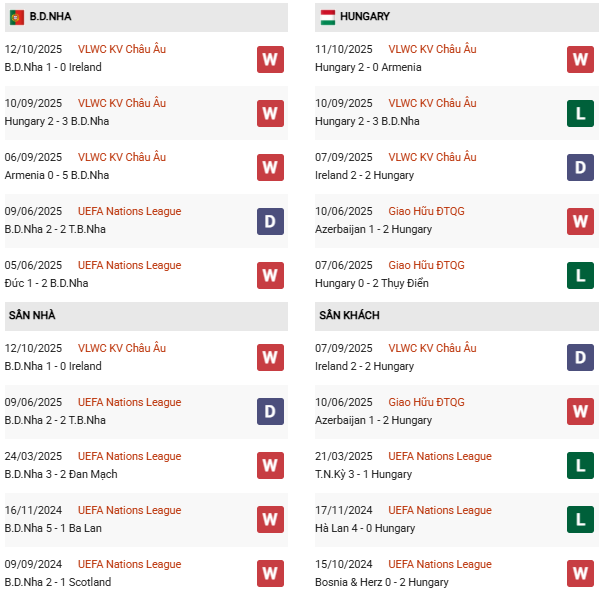 - Trên sân nhà, Bồ Đào Nha thắng cả 2 trận trước Hungary.