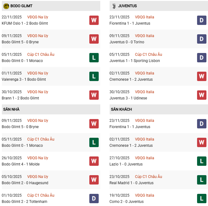 Trong lịch sử, Juventus từng có 8 lần chạm trán các đội bóng Na Uy tại các sân chơi châu Âu, với thành tích bất bại (4 thắng, 4 hòa). Nhưng đây mới là lần đầu tiên họ đụng độ Bodo Glimt. Thành tích này phần nào xua tan đi phong độ ảm đạm của Lão phu nhân tại các sân chơi châu Âu. Họ chỉ thắng 2/12 trận gần nhất tại lục địa già (hòa 6, thua 4).