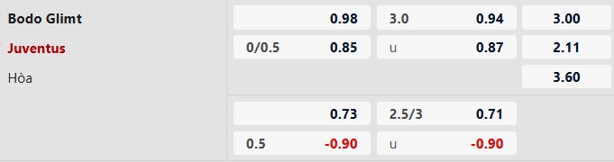 Juventus không thắng theo châu Á: Juventus thua 4, hòa 1, thắng 1 ở 6 trận gần nhất. Họ cũng thua 3, hòa 1, thắng 1 ở 5 chuyến xa nhà gần đây. Trong khi đó, Bodo Glimt thắng 5/7 trận sân nhà vừa qua theo châu Á. Vì thế, nhiều khả năng Juve không thắng theo châu Á ở chuyến làm khách trên đất Na Uy lần này.