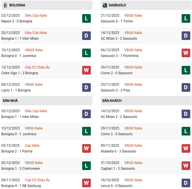 - Trên sân nhà, Bologna thắng 4, thua 5 trước Sassuolo.