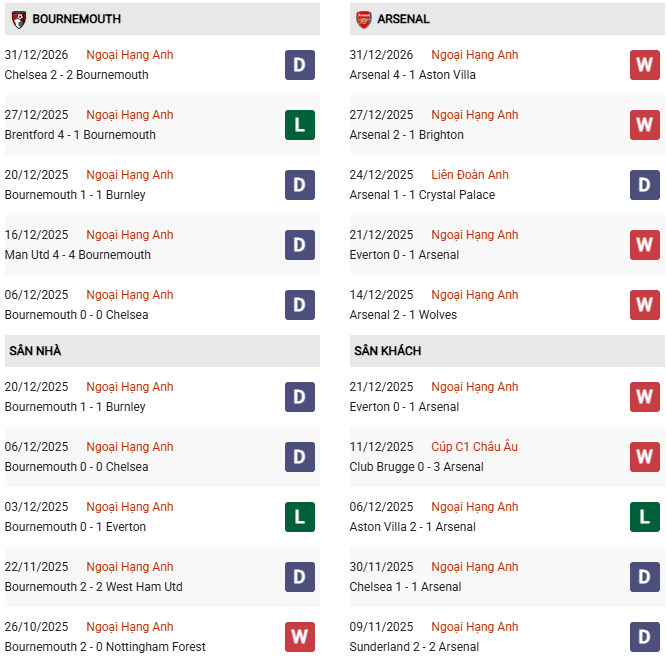 Cuối tuần này Arsenal sẽ phải đối đầu chủ nhà Bournemouth, đội bóng mà họ đã nhận thất bại ở cả 2 trận đối đầu mùa giải trước. Trận thua 1-2 tại Emirates đầu tháng 5/2025 là một phần lý do khiến Arsenal thất bại trong cuộc đua song mã tới ngôi vô địch với Liverpool. Mặc dù vậy, đội đầu bảng có lý do để tin tưởng vào một chiến thắng để đòi lại món nợ đã vay, đồng thời tiếp tục củng cố vị thế số một trong cuộc đua vô địch.