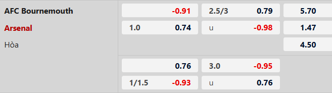 Arsenal thắng châu Á hiệp 1: Lịch sử đối đầu chứng kiến Arsenal thắng theo châu Á 6/8 trận đối đầu gần nhất trong hiệp 1 ở mọi đấu trường. 4 trận vừa qua của Bournemouth, đội bóng này thua châu Á 3 trận trước giờ nghỉ. Với Arsenal, họ thắng châu Á 2 trận sân khách vừa qua trong 45 phút đầu tiên.