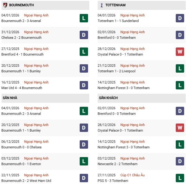 - Trên sân nhà, Bournemouth thắng 2, thua 6 trước Tottenham.