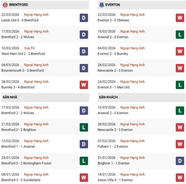 - Trên sân nhà, Brentford thắng 1, thua 1 trước Everton.