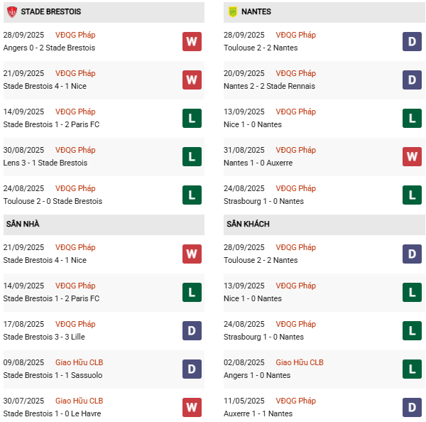 - Brest thắng 5, hòa 2, thua 3 trong 10 trận gặp Nantes gần đây.