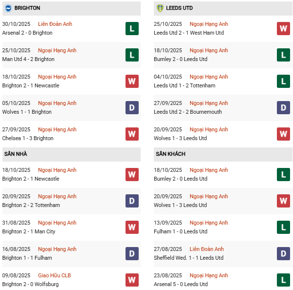 Dự đoán Brighton đấu với Leeds, 22h00 ngày 01/11, vòng 10 Ngoại hạng Anh, sân Amex. Brighton có lợi thế sân nhà và phong độ ổn định hơn, trong khi Leeds thường yếu bóng vía mỗi khi xa nhà.