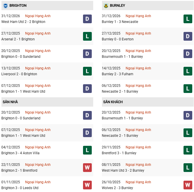- Trên sân nhà, Brighton thắng 2, thua 3 trước Burnley.