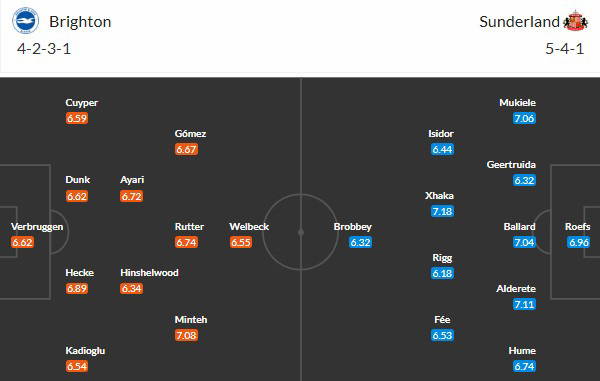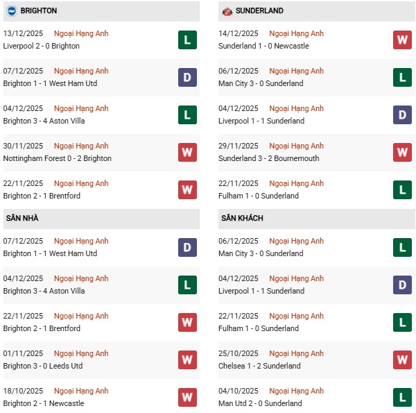 Phong độ 10 trận gần nhất của Sunderland khá ổn định với 4 chiến thắng, 3 trận hòa và 3 thất bại. Dù vậy, thành tích sân khách lại là điểm trừ khi họ chỉ thắng 3, hòa 2 và thua 5 trong 10 chuyến hành quân gần đây. Trước các đối thủ có khả năng kiểm soát thế trận tốt như Brighton, Sunderland thường gặp khó trong việc triển khai lối chơi và duy trì sự chắc chắn ở hàng thủ.