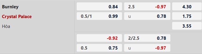 Chẵn bàn thắng: 3/4 trận đối đầu trước đó giữa Burnley và Crystal Palace có tổng bàn thắng chia hết cho 2. Ngoài ra, 3/4 trận vừa xong của Burnley lẫn Crystal Palace đều chứng kiến điều tương tự.