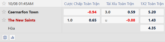 30 bàn thắng sau 11 trận thực sự là hiệu suất quá kinh khủng của The New Saints. Chỉ riêng 5 vòng đấu đã qua, các nhà đương kim vô địch xé lưới đối phương đến 29 lần. Đội chủ nhà Caernarfon Town cũng đã ghi đến 27 bàn mùa này nhưng họ lại gặp vấn đề lớn khi hàng thủ đã phải nhận đến 16 bàn thua. Vậy nên, không bất ngờ nếu The New Saints sẽ tiếp tục thắng cách biệt lớn và tỷ lệ tài xỉu 3 hòa là vừa vặn dành cho sự xuất hiện của kèo Tài sau 90 phút.