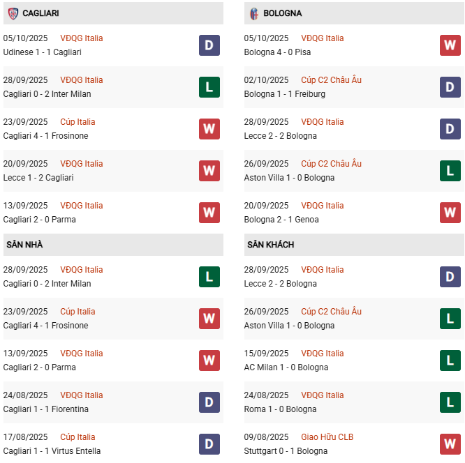- Cagliari thắng 3, hòa 1, thua 6 trong 10 trận gặp Bologna gần đây.