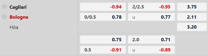 Dễ hiểu khi Bologna vẫn đang được đánh giá cao hơn với tỷ lệ chấp 1/4 bàn. 5 lần chạm mặt gần nhất ở Serie A, Bologna đã đánh bại Cagliari đến 4 lần và chỉ thua 1 trận. Với phong độ đã dần trở lại sau giai đoạn khó khăn, không ngạc nhiên nếu họ có thể quật ngã Cagliari thêm lần nữa ngay trên sân khách.