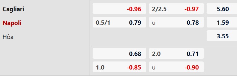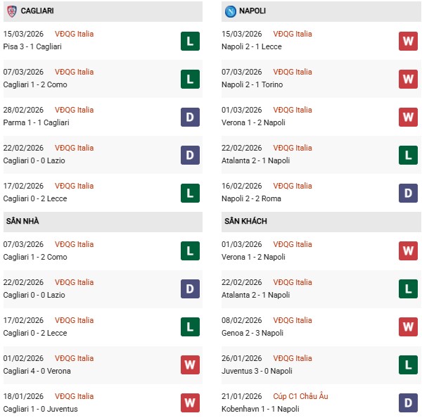 Đáng chú ý, Napoli thường chơi khá tốt trong những chuyến làm khách. Họ đã thắng 2/3 trận sân khách gần nhất tại giải quốc nội, bao gồm các chiến thắng trước Verona và Genoa. Lịch sử đối đầu cũng đang ủng hộ Napoli khi họ bất bại trong 5 lần gặp Cagliari gần đây, trong đó giành tới 3 chiến thắng.