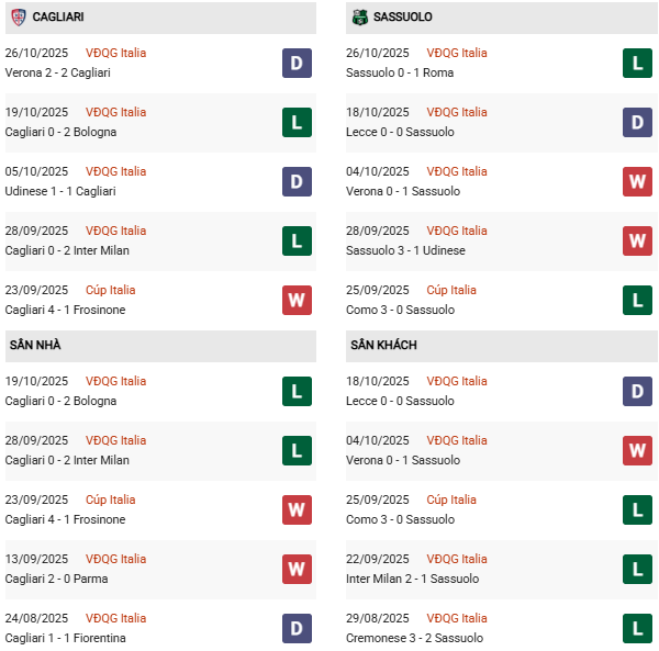 - Cagliari thắng 3, hòa 5, thua 2 trong 10 trận gặp Sassuolo gần đây.