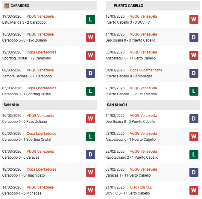 - Carabobo thắng 6 và hòa 4 trong 10 lần gần nhất gặp Puerto Cabello.