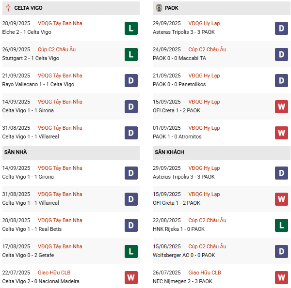 Sau lịch thi đấu dày đặc 3 trận liên tiếp, thầy trò Claudio Giráldez sẽ được trở về sân nhà cho 4 trận liền, lần lượt gặp PAOK, Atletico Madrid, Sociedad và Nice. Chắc chắn, NHM Celta Vigo sẽ hy vọng lợi thế sân nhà sẽ mở ra khởi đầu mới cho mùa giải 2025/26. Đáng chú ý, trong 4 lần đối đầu các đội Hy Lạp tại cúp châu Âu trước đây, Celta Vigo bất bại với 3 chiến thắng và 1 trận hòa.
