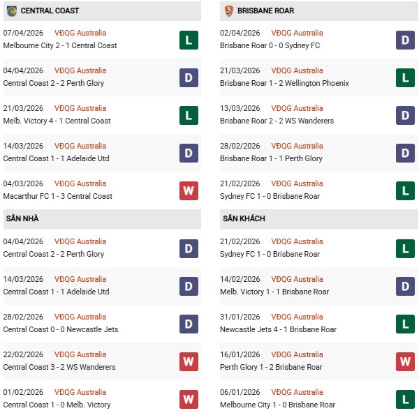 - Trên sân nhà, Central Coast thắng 3, thua 6 trước Brisbane Roar.