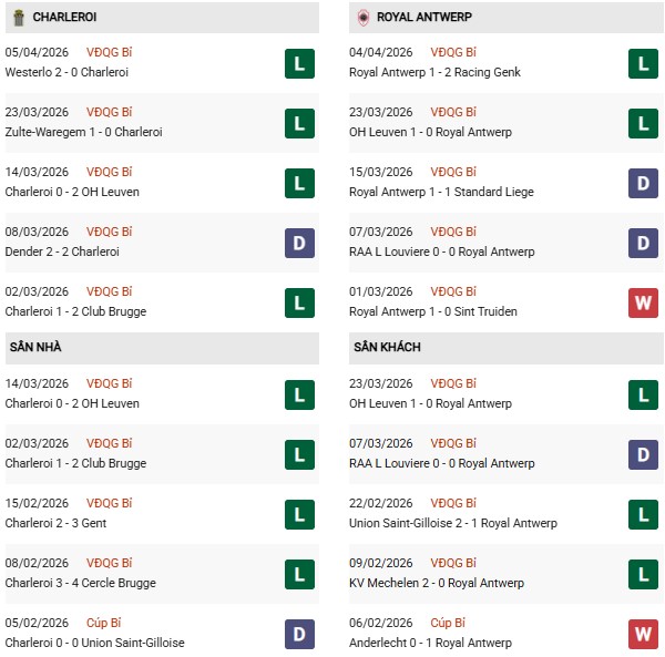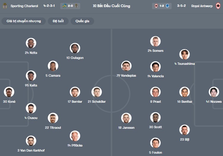 Đáng chú ý, Antwerp cũng không có phong độ ấn tượng trên sân khách khi thua 3/6 trận gần đây, trong đó có những chiến thắng quan trọng trước các đối thủ cạnh tranh trực tiếp. Dù vậy, với lối chơi chặt chẽ và kỷ luật, Antwerp hoàn toàn có thể gây khó khăn cho một Charleroi đang bất ổn.