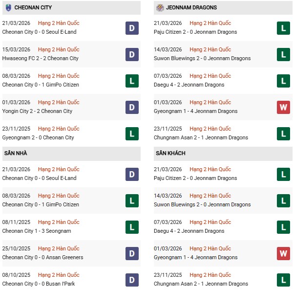 - Trên sân nhà, Cheonan thắng 1, thua 2 trước Jeonnam Dragons.