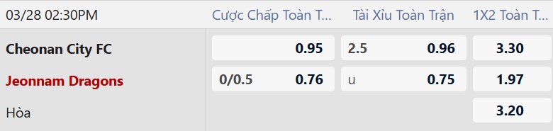 5 trận sân nhà gần nhất, Cheonan City ghi được đúng 1 bàn nhưng đổi lại đến 4 hôm hoặc giữ sạch lưới hoặc nhận đúng 1 bàn thua. Phía đối diện, Jeonnam Dragons đã 2 trận liền không ghi nổi bàn nào. Với tình trạng như vậy của đôi bên cùng thực tế 4/6 màn chạm trán gần nhất có dưới 3 pha lập công thì 90 phút sắp tới xem ra sẽ ít bàn.