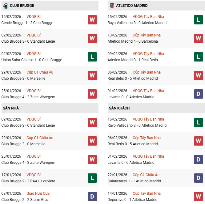 Đang “vào phom”, đội bóng thủ đô Madrid có lý do để tự tin hành quân đến sân của Club Brugge. Nên nhớ rằng, ở đấu trường cúp, đoàn quân của ông Simeone cũng chơi rất tốt trên sân khách. Họ bất bại 5 trận gần đây, trong đó thắng 4, gần nhất là màn vùi dập Betis 5-0 ở tứ kết Cúp Nhà Vua.