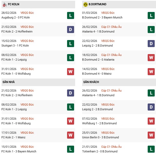 - Cologne thắng 2, hòa 2, thua 6 trong 10 trận gặp Dortmund gần đây.