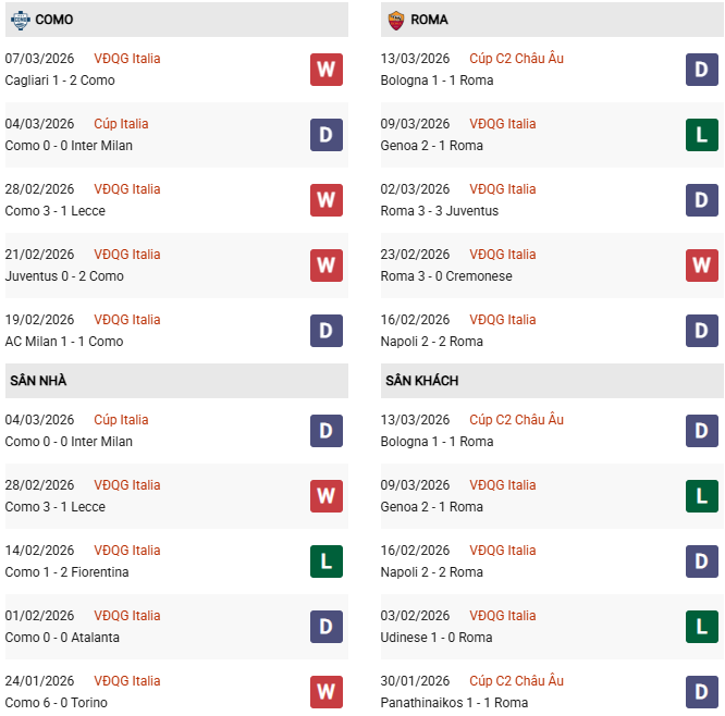 - Como thắng 2, hòa 3 trong 5 trận gặp Roma gần đây.