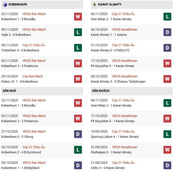Cho đến thời điểm hiện tại, thành tích tốt nhất của Copenhagen ở sân chơi số 1 châu Âu mùa này vẫn là trận hòa 2-2 trước Leverkusen vào ngày khai mạc. Kể từ đó, họ đã gặp khó khăn trong việc phòng ngự, thua 0-2 tại Qarabag, 0-4 trước Tottenham và 2-4 trên sân nhà trước Dortmund. Vì thế, thầy trò HLV Neestrup sẽ phải nỗ lực nhiều hơn để giành kết quả như ý trước Kairat Almaty, đội cũng gặp khó khăn tương tự.
