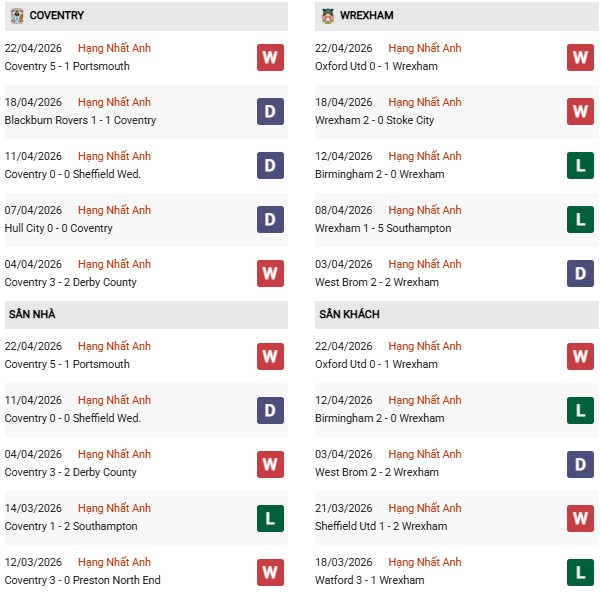 - Coventry City hòa 1, thua 3 trong 4 trận gặp Wrexham gần đây.