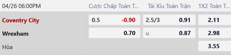 Mức chấp 1/2 bàn phản ánh đúng vị thế của đội đầu bảng khi được chơi trên sân nhà. Tuy nhiên, đây là tỷ lệ tiềm ẩn nhiều rủi ro cho cửa trên. Coventry City đã hết động lực thi đấu trong khi Wrexham lại đang khao khát điểm số hơn bao giờ hết để bảo vệ vị trí trong Top 6. Với tinh thần thi đấu vì "sống còn", Wrexham hoàn toàn đủ khả năng gây khó khăn và ra về với một kết quả có lợi.