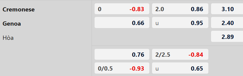 2 bàn trở lên: 3 trận gần đây của Genoa họ đều thắng hoặc thua đối phương với tỷ số 3-2. 8/9 trận sân nhà vừa qua của Cremonese ở Serie A cũng có tối thiểu 2 lần lưới rung. Do tỷ lệ niêm yết chỉ là 2, có thể dự đoán luôn hoặc đợi tỷ lệ hạ xuống 1 3/4 hoặc 1 1/2 rồi cổ vũ nhiều bàn.