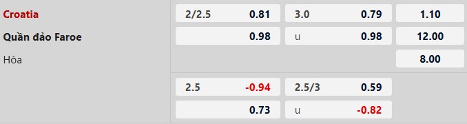 Croatia thua theo châu Á: Croatia thua theo châu Á ở 3/4 trận gần đây tại vòng loại World Cup và thua theo châu Á ở lần đối đầu mới nhất với Đảo Faroe. Đảo Faroe thắng 3, hòa 1/4 trận vừa qua theo châu Á.