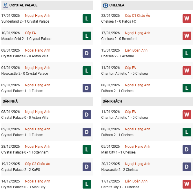 Lịch sử đang đứng hoàn toàn về phía Chelsea. Trong 16 lần đụng độ gần nhất tại Premier League, The Blues giữ thành tích bất bại trước đối thủ cùng thành phố. Lượt đi mùa này hai đội kết thúc với tỷ số 0-0 nhưng đó là khi Chelsea còn loay hoay dưới thời HLV Enzo Maresca. Tại Selhurst Park, Chelsea thường xuyên bắt nạt đội chủ nhà với những chiến thắng sít sao. Thật sự Chelsea buộc lòng phải có 3 điểm trước đội bóng có phong độ thấp nhất giải.