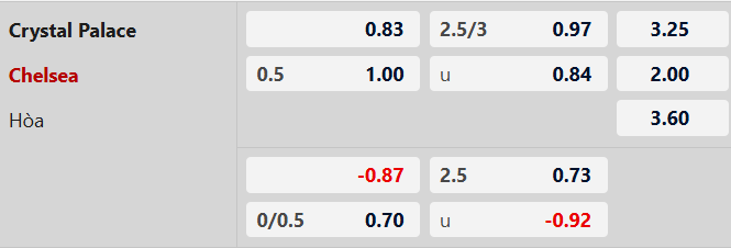 Cán cân đang nghiêng hoàn toàn về kịch bản Chelsea giành phần thắng. Nếu nhìn vào màn trình diễn của Crystal Palace thời gian qua thì Chelsea gần như nắm chắc 3 điểm. Chelsea được xếp ở cửa trên khi chấp Crystal Palace 1/2 bàn. Lịch sử đối đầu thể hiện rõ ràng Chelsea gặp Crystal Palace gần như toàn thắng, hiếm hoi mới có trận Hòa. Khi mà Crystal Palace đang liên tục thủng lưới và mất cảm giác ghi bàn, Chelsea hứa hẹn mang về niềm vui cho giới đầu tư.