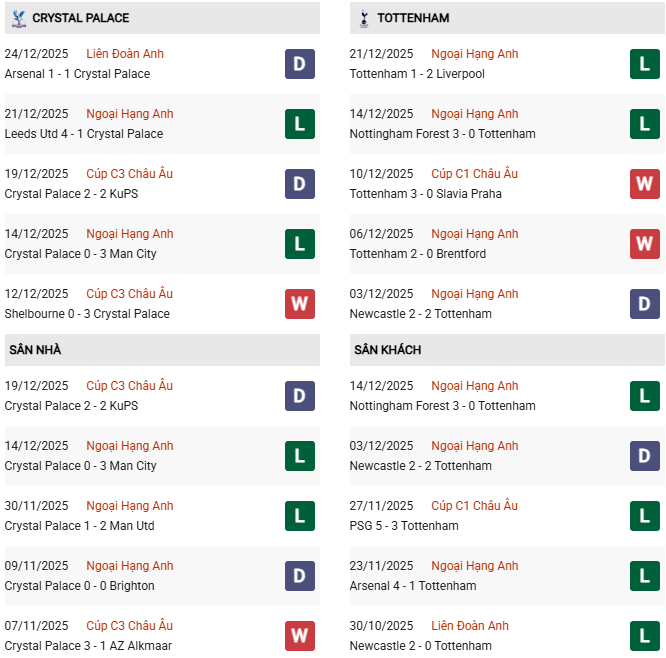 Xét tổng thể, đây là trận đấu mà cả hai đội đều cần điểm để chặn đứng đà sa sút. Palace dù tổn thất lực lượng nhưng có lợi thế sân nhà và tinh thần quyết tâm sau thất bại cay đắng trước Arsenal. Tottenham sở hữu hàng công tiềm năng, song sự bất ổn nơi hàng thủ khiến họ khó tạo ra thế trận áp đảo. Một kịch bản giằng co, nhiều sai lầm và có bàn thắng cho cả hai phía là điều hoàn toàn có thể xảy ra.