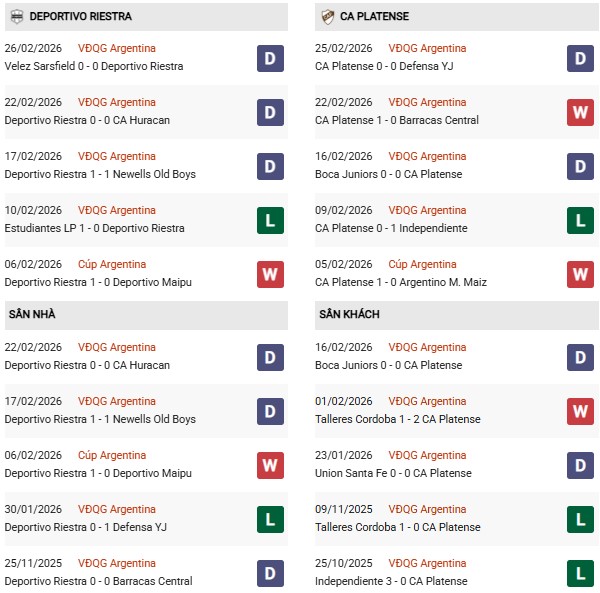 - Trên sân nhà, Dep. Riestra thắng 2, thua 1 trước Platense.