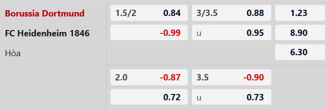 Từ 2 đến 3 bàn thắng: 6/8 trận gần đây của Dortmund cùng 7/9 trận vừa qua của Heidenheim đều kết thúc với từ 2 đến 3 lần lưới rung. Lịch sử cũng chứng kiến 2 trận gặp nhau gần nhất có từ 2 đến 3 bàn thắng được ghi.