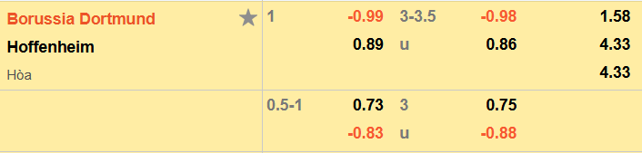 Dortmund ghi bàn hiệp 1: Dortmund ghi ít nhất 1 bàn trong hiệp 1 ở 7/8 cuộc đối đàu nhất, ở 5/8 lần gần nhất đón tiếp Hoffenheim trên sân nhà. Ngoài ra, họ cũng ghi được bàn trong hiệp 1 ở 3/4 trận vừa qua, ở 6/8 trận sân nhà vừa qua. Trận này khó có ngoại lệ.