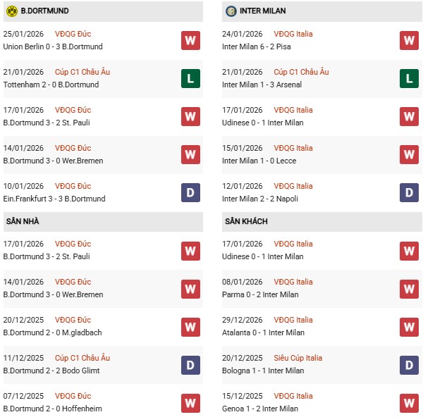 - Dortmund thắng 1, thua 1 trong 2 trận gặp Inter Milan gần đây.