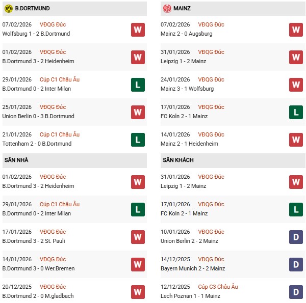 Vào cuối tuần trước, Dortmund và Mainz đều giành chiến thắng. Trong khi Mainz đánh bại Augsburg với tỷ số 2-0 thì Dortmund phải chật vật mới vượt qua Wolfsburg 2-1. Trên BXH Bundesliga 2025/26, Dortmund đang đứng thứ 2 khi có 48 điểm, kém ĐKVĐ Bayern 6 điểm.