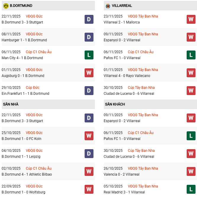 - Dortmund hòa 1, thua 1 trong 2 trận gặp Villarreal gần đây.