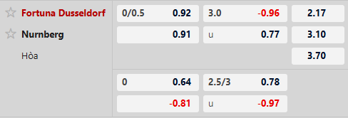 Xét phong độ hiện tại, Dusseldorf vẫn chưa thực sự bùng nổ nhưng ít ra họ còn duy trì được sự ổn định. Ngược lại, thất bại tan nát ở vòng đấu trước cho thấy Nurnberg khó lòng tạo bất ngờ trên sân khách lần này. Trận đấu tới cũng là cơ hội để Dusseldorf tìm kiếm chiến thắng sân nhà đầu tiên trong mùa. Với tỷ lệ cược 1/4 bàn, lựa chọn cửa trên rõ ràng mang lại sự hợp lý.