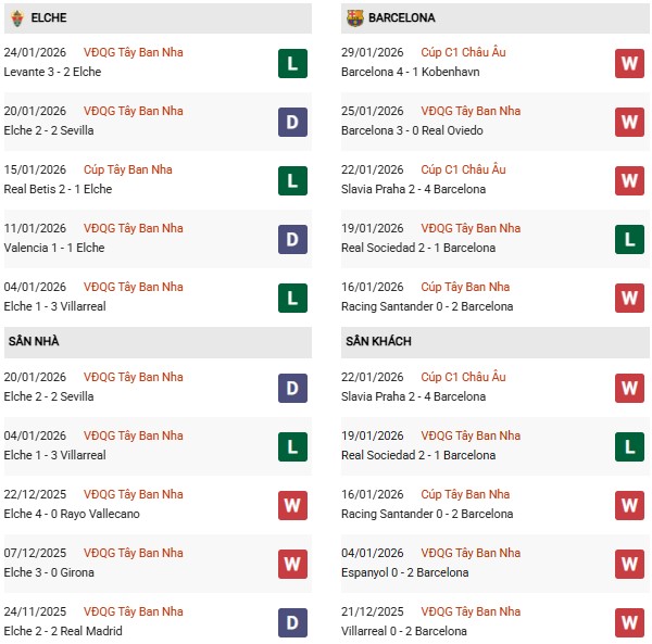 Riêng tại sân chơi La Liga, Elche chỉ có 1 chiến thắng, 2 trận hòa và 2 trận thua ở 5 trận gần nhất. Chuỗi trận không ổn định này đã góp phần vào vị trí thứ 11 trên BXH hiện tại của họ, mặc dù thành tích sân nhà mang lại một số tín hiệu tích cực. Tại thánh địa Martinez Valero, họ đã giành được 5 chiến thắng, 5 trận hòa và chỉ thua 1 trận, cho thấy khả năng thi đấu tốt hơn trên sân nhà.