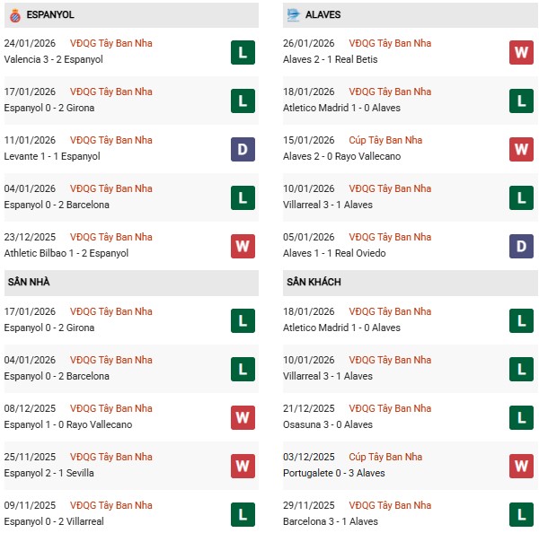 - Trên sân nhà, Espanyol thắng 7, thua 1 trước Alaves.