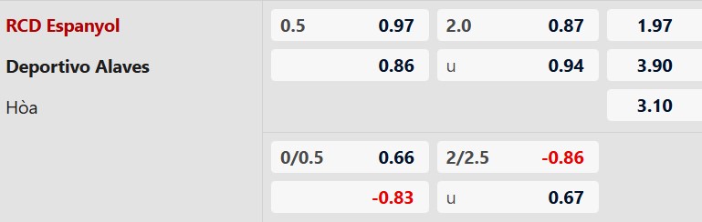 Cả hai đội ghi bàn: Các cầu thủ Espanyol đã để thủng lưới ở 4 trong 5 trận đấu gần nhất tại giải VĐQG, trong khi Alaves đã ghi bàn vào lưới Real Betis ở trận đấu tuần trước, cho thấy họ vẫn có thể gây nguy hiểm ngay cả khi kiểm soát trận đấu không được tốt. Lịch sử đối đầu cũng chứng kiến 3/4 trận gặp nhau gần nhất giữa đôi bên bàn thắng đều đến ở hai đầu khung thành.